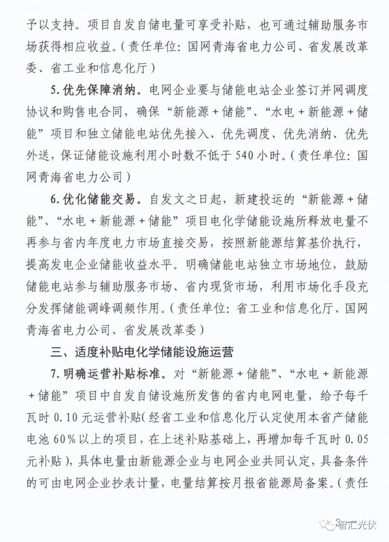 4)對"新能源+儲(chǔ)能” 、"水電+新能源 + 儲(chǔ)能”項(xiàng)目中自發(fā)自儲(chǔ)設(shè)施所發(fā)售的省內(nèi)電網(wǎng)電量,給予每千瓦時(shí)0.10元運(yùn)營補(bǔ)貼(經(jīng)省工業(yè)和信息化廳認(rèn)定使用本省產(chǎn)儲(chǔ)能 電池 60%以上的項(xiàng)目,在上述補(bǔ)貼基礎(chǔ)上,再增加每千瓦時(shí)0.05 元補(bǔ)貼),具體電量由新能源企業(yè)與電網(wǎng)企業(yè)共同認(rèn)定,具備條件 的可由電網(wǎng)企業(yè)抄表計(jì)量,電量結(jié)算按月報(bào)省能源局備案。
