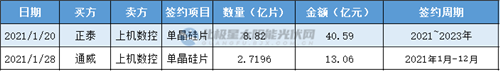 1月20日,無錫上機數(shù)控股份有限公司全資子公司弘元新材料(包頭)有限公司與正泰電器全資子公司浙江正泰太陽能科技有限公司、海寧正泰新能源科技有限公司、鹽城正泰新能源科技有限公司、鹽城正泰太陽能科技有限公司、海寧正泰太陽能科技有限公司和杭州民泰進出口貿(mào)易有限公司簽訂了單晶硅片采購合同。2021~2023年,正泰將向上機數(shù)控采購單晶硅片8.82億片(上下浮動不超過10%),實際采購價格采取月度議價方式。其中2021年預(yù)計采購不低于2.1億片,2022年采購3.36億片,2023年采購3.36億片。參照PVInfolink最新公布的價格及排產(chǎn)計劃測算,預(yù)計合同金額約為三年總計40.59億元(含稅)。雙方約定,每個月月底之前簽訂次月補充協(xié)議,次月支付完畢相應(yīng)貨款。