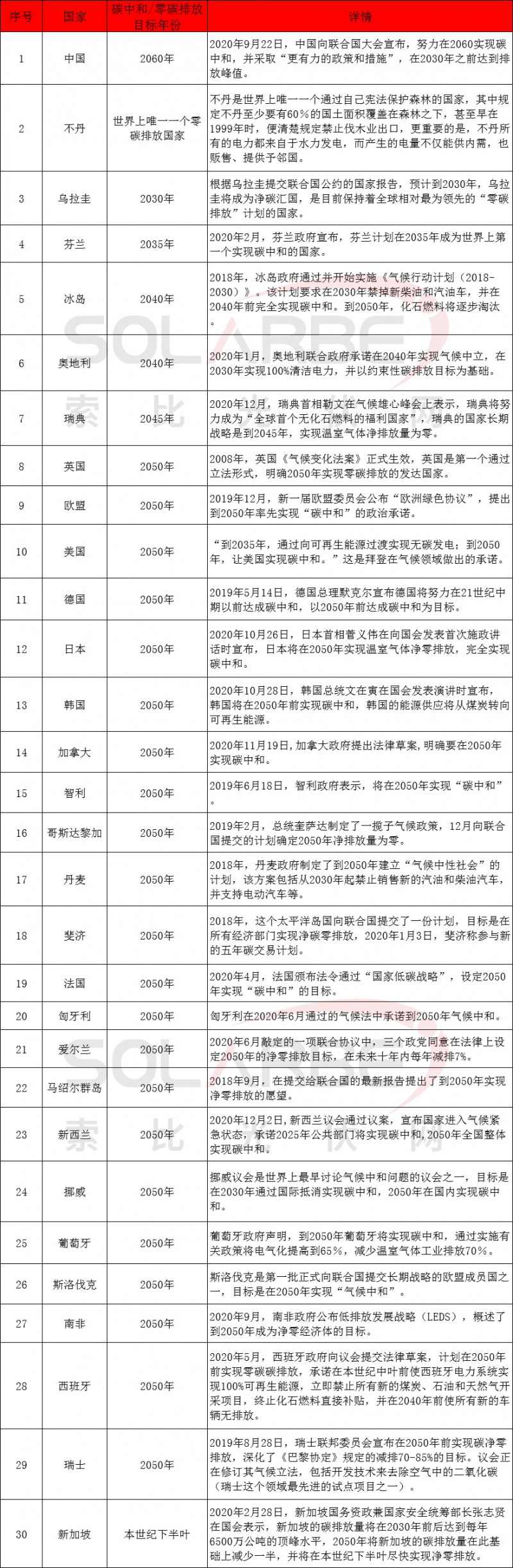 在全球綠色低碳轉(zhuǎn)型大勢(shì)不可逆轉(zhuǎn)的背景之下,全球各個(gè)國(guó)家針對(duì)碳減排目標(biāo)已達(dá)成共識(shí),據(jù)索比光伏網(wǎng)不完全統(tǒng)計(jì),以下30個(gè)國(guó)家紛紛設(shè)立了碳中和或凈零排放目標(biāo),全球碳中和時(shí)代正在開(kāi)啟。