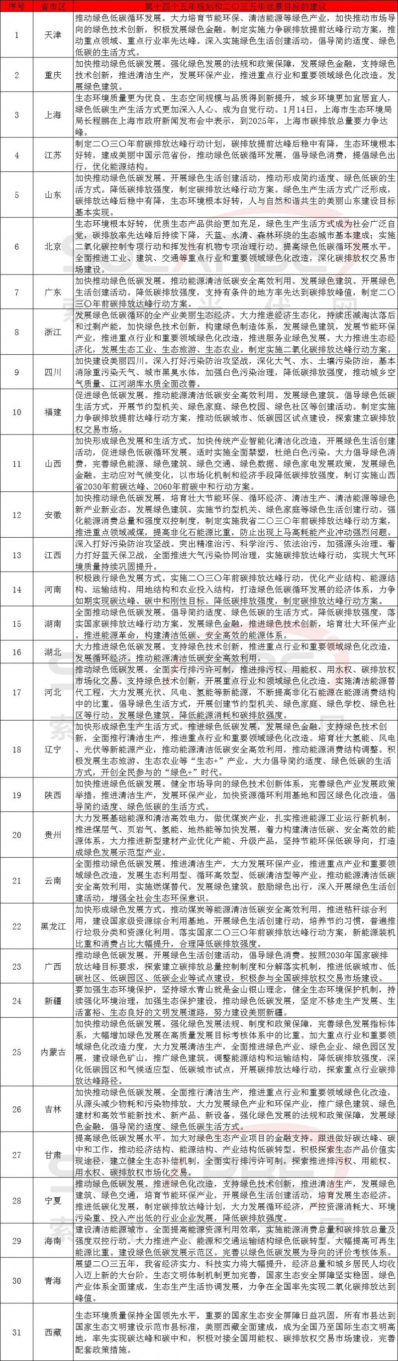 2020年底,全國(guó)31個(gè)省市區(qū)先后發(fā)布第十四個(gè)五年規(guī)劃和二〇三五年遠(yuǎn)景目標(biāo)的建議,紛紛提出推動(dòng)綠色低碳循環(huán)發(fā)展,提高生態(tài)環(huán)境質(zhì)量,制定2030年碳排放達(dá)峰行動(dòng)方案,實(shí)現(xiàn)碳排放提前達(dá)峰后穩(wěn)中有降,大力發(fā)展新能源和綠色建筑,推進(jìn)清潔生產(chǎn),加快形成綠色生產(chǎn)生活方式。