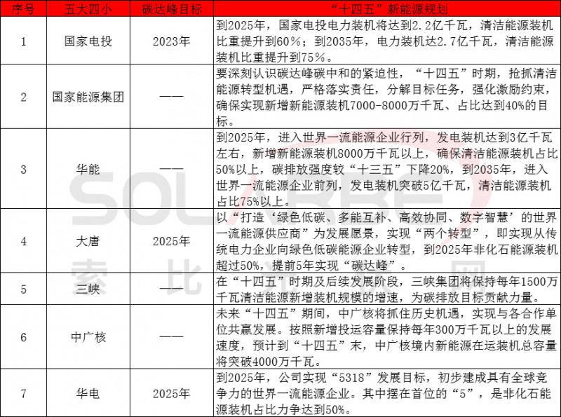 目前,五大四小中已有7家能源央企發(fā)布了“十四五”新能源規(guī)劃,據(jù)索比光伏網(wǎng)統(tǒng)計(jì),國(guó)家電投、國(guó)家能源集團(tuán)、華能、大唐、三峽、中廣核的“十四五”新能源裝機(jī)規(guī)劃合計(jì)已超400GW。其中國(guó)家電投、大唐、華電公布了碳達(dá)峰目標(biāo),國(guó)家電投黨組書(shū)記、董事長(zhǎng)錢(qián)智民宣布,到2023年國(guó)家電投將實(shí)現(xiàn)在國(guó)內(nèi)的“碳達(dá)峰”。大唐集團(tuán)董事長(zhǎng)鄒磊提出到2025年中國(guó)大唐的非化石能源裝機(jī)要超過(guò)50%,并提前5年實(shí)現(xiàn)“碳達(dá)峰”。目前,華電集團(tuán)表示,到2025年集團(tuán)非化石能源裝機(jī)占比力爭(zhēng)達(dá)到50%,有望2025年實(shí)現(xiàn)碳排放達(dá)峰。