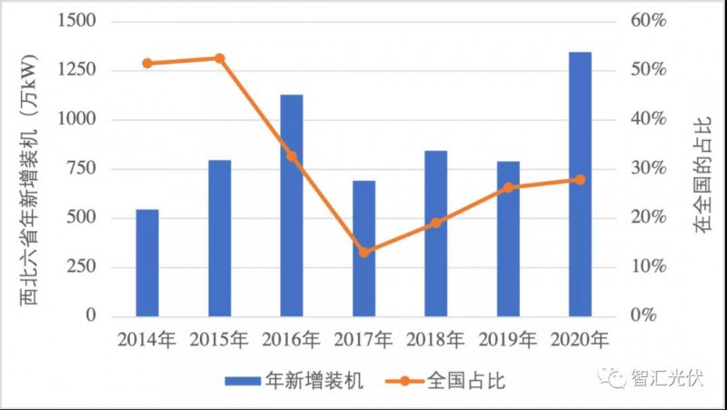 下圖統(tǒng)計(jì)了最近七年(2014~2020年)西北六省(新疆、青海、甘肅、寧夏、陜西、內(nèi)蒙古)的年新增裝機(jī)規(guī)模,以及在當(dāng)年總新增裝機(jī)中的占比。