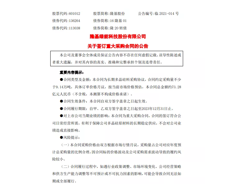 2月2日,隆基股份發(fā)布公告,未來(lái)三年(2021-2023)擬向保利協(xié)鑫旗下子公司江蘇中能采購(gòu)多晶硅9.14萬(wàn)噸。按照當(dāng)前成交價(jià),該合同總金額約73.28億元人民幣(不含稅)。合同總金額占公司2019年度經(jīng)審計(jì)營(yíng)業(yè)成本的約31.33%,年均合同金額占公司 2019年度經(jīng)審計(jì)營(yíng)業(yè)成本的約10.44%(本測(cè)算不構(gòu)成價(jià)格承諾)。
