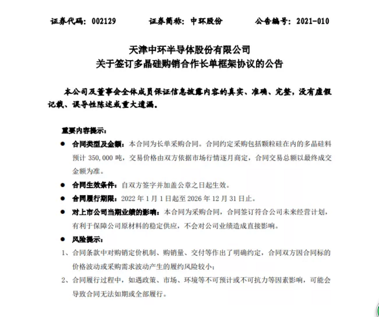 保利協(xié)鑫與隆基簽訂大單之后,再度斬獲中環(huán)股份大單,根據(jù)合同約定2022年1月1日起至2026年12月31日期間中環(huán)股份向保利協(xié)鑫采購(gòu)包括顆粒硅在內(nèi)的多晶硅料預(yù)計(jì)350,000噸,預(yù)估合同總金額約317億元人民幣(不含稅),交易金額以最終成交金額為準(zhǔn)。產(chǎn)品結(jié)構(gòu)包括顆粒硅、特級(jí)免洗疏松料、特級(jí)免洗致密料,實(shí)際每年交易量和產(chǎn)品結(jié)構(gòu)將均分至各月執(zhí)行,具體以每月合同確認(rèn)單為準(zhǔn)。