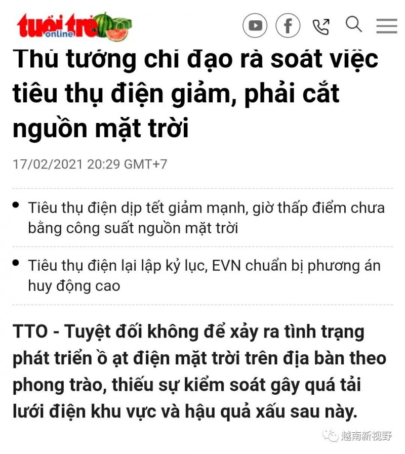 據(jù)“越南新視野”報道,2月17號下午,越南總理阮春福發(fā)文件給越南工商部、各省市政府、越南電力集團(EVN) ,對發(fā)展太陽能光伏產(chǎn)業(yè)的相關問題做出指示,將對越南光伏發(fā)展進行一定的限制。