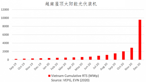2019年底,越南的屋頂光伏裝機量為378MW,根據(jù)越南越南國有電力公司(EVN)發(fā)布的最新統(tǒng)計,2020年底累計屋頂光伏裝機量為9.583GW,相比2019年增長了9.205GW,并且該數(shù)據(jù)還在進一步向上修正。