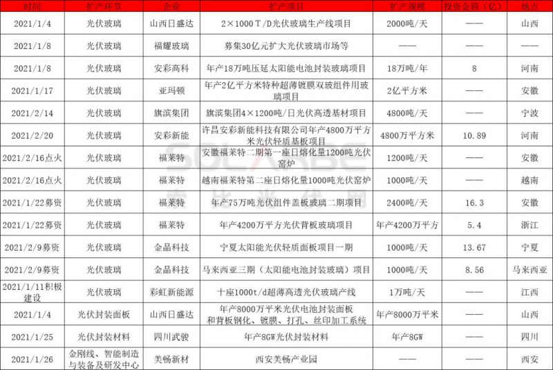 自去年12月16日工信部宣布放開光伏玻璃擴(kuò)產(chǎn)限制后,2021年開年至今,安彩高科、安彩新能、亞瑪頓紛紛加速光伏玻璃擴(kuò)產(chǎn)。1月8日,安彩高科宣布與博愛凌創(chuàng)合資成立焦作安彩新材料有限公司,開展年產(chǎn)18萬噸壓延太陽能電池封裝玻璃項目建設(shè)。1月17日,亞瑪頓旗下鳳陽硅谷智能有限公司二期項目“年產(chǎn)2億平方米特種超薄鍍膜雙玻組件用玻璃項目”在滁州舉行開工儀式。2月20日,安彩新能年產(chǎn)4800萬平方米光伏輕質(zhì)基板項目開工,項目投資10.89億,涵蓋1.8~4.0mm厚度光伏玻璃產(chǎn)品,支持超大規(guī)格電池組件。