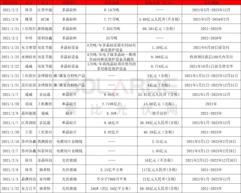 光伏玻璃方面,2021-2023年隆基與金晶科技、福萊特累計簽訂光伏玻璃采購超3.15億平方米,采購價格113億;晶澳科技未來兩年向亞瑪頓采購光伏玻璃不少于7960萬平米;東方日升將于2021-2023年向福萊特采購光伏玻璃34GW。