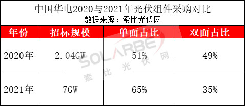 自2020年起,華電集團組件采購只選擇單晶組件。索比光伏網(wǎng)比較后發(fā)現(xiàn),從采購規(guī)模來看,2021年華電組件采購7GW,比2020年的2.04GW增加243%;從組件類型來看,2020年華電單、雙面組件采購比例基本持平,但2021年雙面組件采購比例明顯下降,占比35%,比去年下滑14個百分點。值得一提的是,華電招標(biāo)文件將組件分為單面單玻、雙面雙玻,并未考慮單玻+透明背板產(chǎn)品。