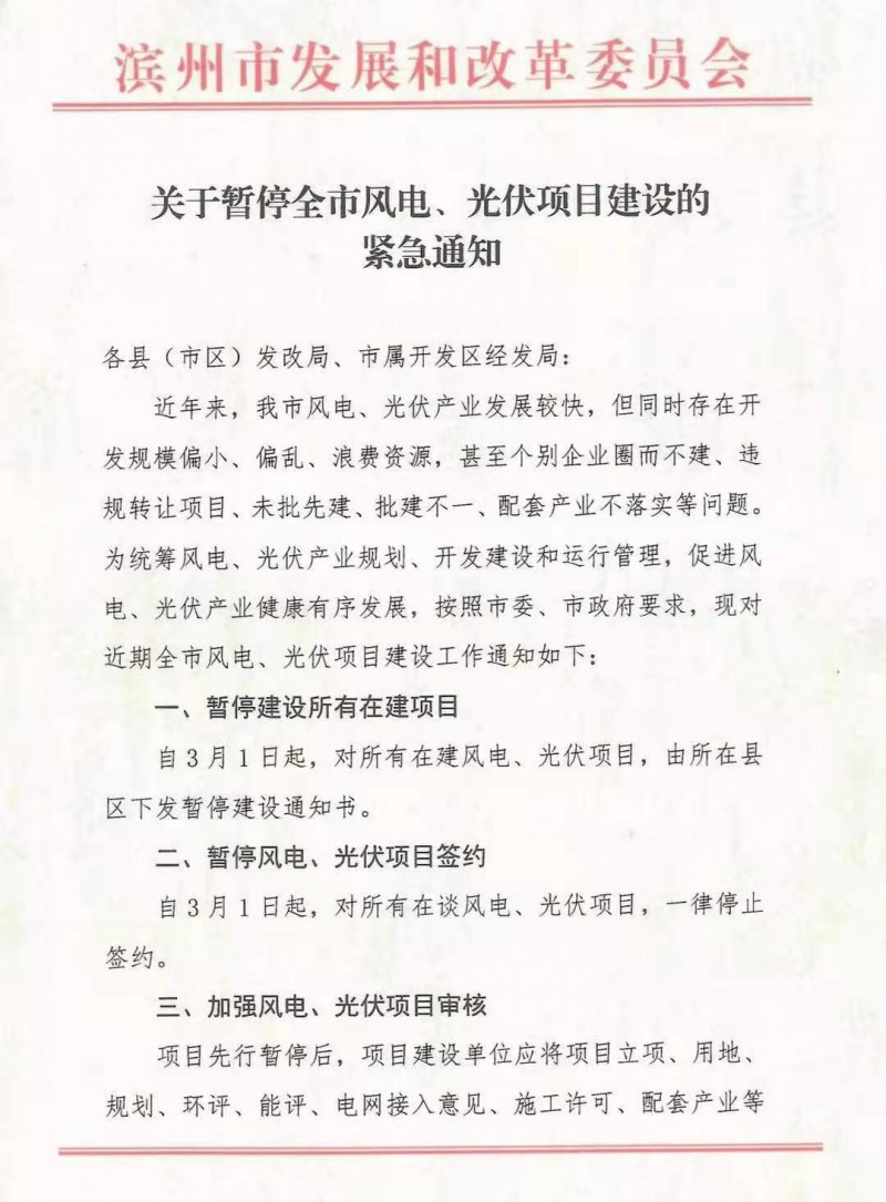 3月1日,山東省濱州市發(fā)改委下發(fā)《關(guān)于暫停全市風(fēng)電、
