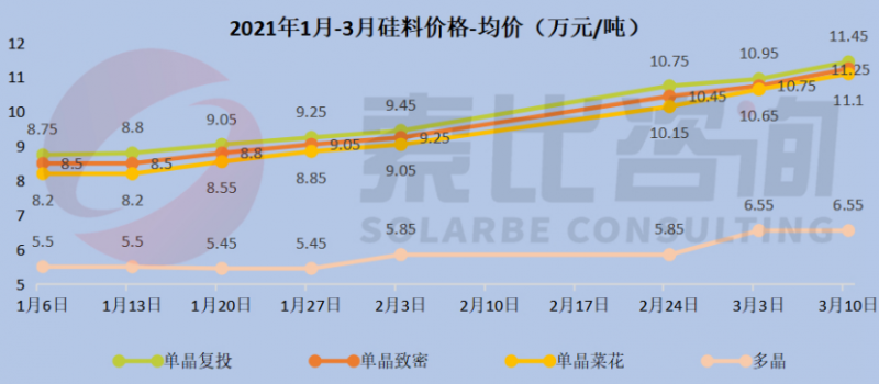 單晶復投均價11.45萬元/噸,環(huán)比上漲4.57%,近三周平均漲幅6.73%,最高成交價11.90萬元/噸,預計下周最高價將突破12萬元/噸;