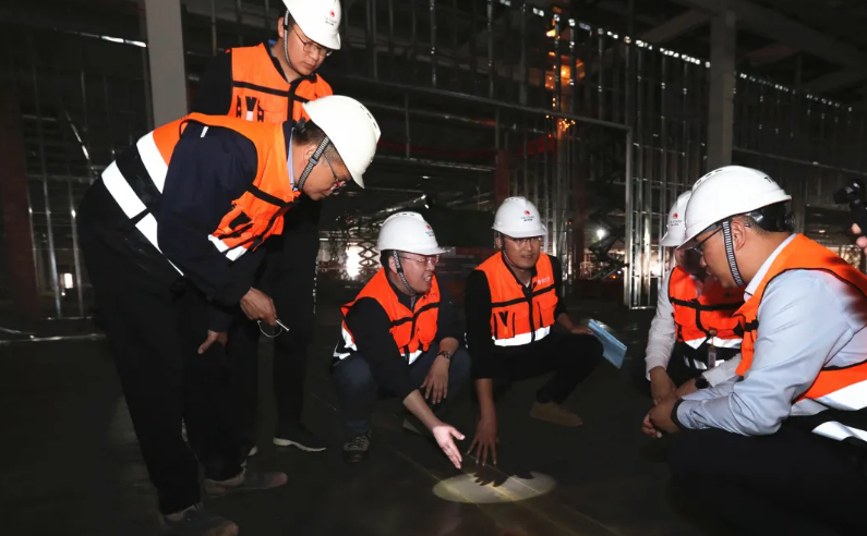 在搶時間、搶工期的進程中,品質(zhì)和安全始終是放在第一位的。李勇是金堂基地工程部員工,負責項目現(xiàn)場的安全施工。3月17日下午13:00,李勇召集18家參建單位在項目部會議室召開了安全專項檢查會議,在簡單介紹了檢查內(nèi)容后,檢查小組并出發(fā)前往施工現(xiàn)場開展安全檢查:從吊車人員作業(yè)證到地面施工打圍,從施工用電到高空作業(yè)安全措施,李勇對照著安全檢查清單一一確認,14:30,安全檢查工作結束。悶熱的下午,一趟下來,記者已經(jīng)是大汗淋漓,李勇早已習慣如常,“安全是工程建設的前提,此次是專項檢查,重點檢查三家參建單位的安全施工情況,如果是綜合大檢查,涉及面更廣、時間更長,不敢有絲毫的懈怠。”李勇說。