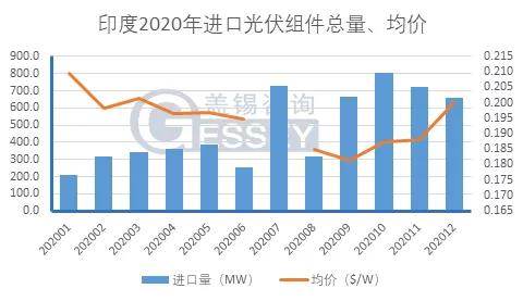 蓋錫咨詢(“GESSEY”),作為權(quán)威的全球新能源咨詢平臺(tái),長(zhǎng)期致力于新能源市場(chǎng)數(shù)據(jù)的收集、分析、反饋,提供及時(shí)有效準(zhǔn)確的太陽能光伏行業(yè)資訊。其最新報(bào)告顯示,2020年,印度全年進(jìn)口光伏組件5.7GW,其中12月進(jìn)口總量656.7MW,12月進(jìn)口均價(jià)0.200$/W。