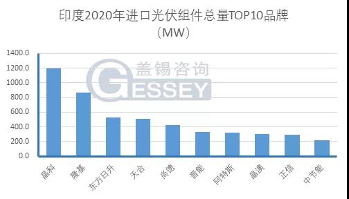 根據(jù)報(bào)告數(shù)據(jù),2020全年,在印度流通光伏組件品牌以全球知名光伏組件品牌為主。其中,晶科、隆基、東方日升、天合、尚德位列印度全年進(jìn)口光伏組件總量TOP5。晉能、阿特斯、晶澳、正信、中節(jié)能處于印度光伏組件出貨量第二梯隊(duì),分列6至10名。TOP10企業(yè)占印度全年組件進(jìn)口總量的87%,頭部效應(yīng)顯著。