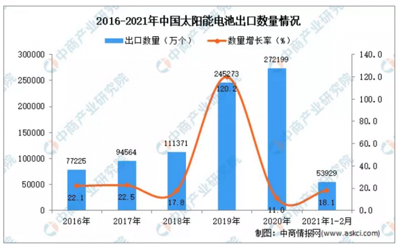 2020年-2021年1-2月中國太陽能電池出口量及金額增長情況。