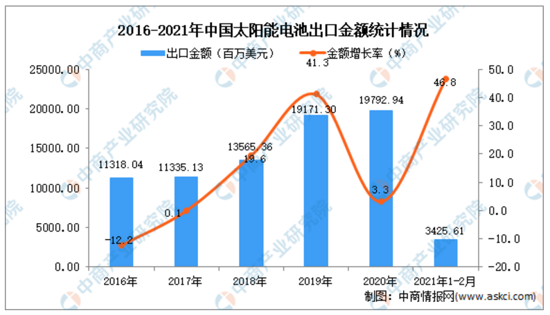 從金額方面來看,2021年1-2月太陽能電池出口金額為3425.61百萬美元,同比增長46.8%。