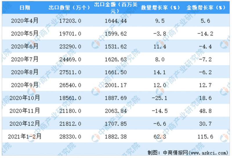 據(jù)中商產(chǎn)業(yè)研究院數(shù)據(jù)庫顯示,2021年1-2月中國