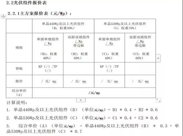 而本次光伏組件評標(biāo)主要從光伏組件轉(zhuǎn)化效率、衰減率、環(huán)境適應(yīng)性、運(yùn)維費(fèi)用、業(yè)績、供貨能力、服務(wù)水平、備件及專用工具等進(jìn)行全壽命周期的綜合評價(jià)。組件投標(biāo)綜合單價(jià)(A)(單位元/wp)=單晶440Wp及以上光伏組件(B)*0.3 + 單晶530Wp及以上光伏組件(C)* 0.7。