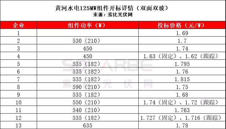 從投標(biāo)價(jià)格來看(報(bào)價(jià)含1000公里運(yùn)費(fèi)),半數(shù)企業(yè)投標(biāo)價(jià)格在1.7元/W以上,且大部分為一線廠商(上表標(biāo)紅)。其中,企業(yè)1報(bào)價(jià)最低為1.59元/W,投標(biāo)組件型號為440W單面組件。