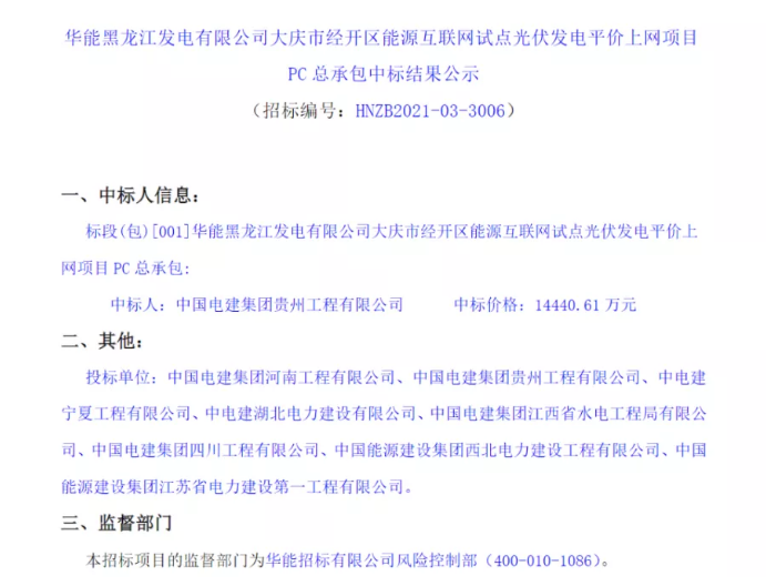 中國(guó)電建集團(tuán)貴州工程有限公司中標(biāo),中標(biāo)總價(jià)為14440.61萬元,中標(biāo)單價(jià)為1.43元/W。
