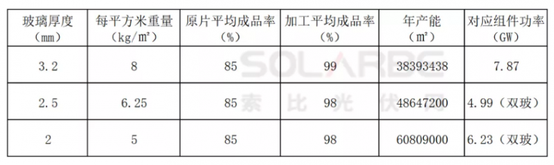 對于一個日融化量1000噸的玻璃窯爐,生產(chǎn)3.2mm、2.5mm、2.0mm三種厚度的光伏玻璃,產(chǎn)能產(chǎn)量情況見下表: