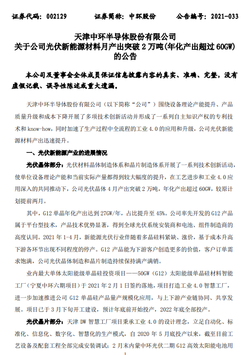 公告強調(diào),隨著產(chǎn)能不斷提升,預(yù)計將對公司光伏硅材料的產(chǎn)銷規(guī)模和經(jīng)營業(yè)績持續(xù)產(chǎn)生顯著貢獻。同時,考慮到G12硅片產(chǎn)品優(yōu)勢明顯,公司G12硅片產(chǎn)能、產(chǎn)量逐月增長,在產(chǎn)品結(jié)構(gòu)中的占比不斷升高,將提升公司的成本優(yōu)勢、盈利能力。公司有信心按照既定戰(zhàn)略加快G12規(guī)劃產(chǎn)能建設(shè)步伐,在光伏新能源材料產(chǎn)業(yè)建立持續(xù)領(lǐng)先優(yōu)勢。