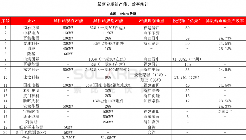 從規(guī)劃布局來看,異質結規(guī)劃產(chǎn)能多分布在福建、安徽、浙江、山西等地。