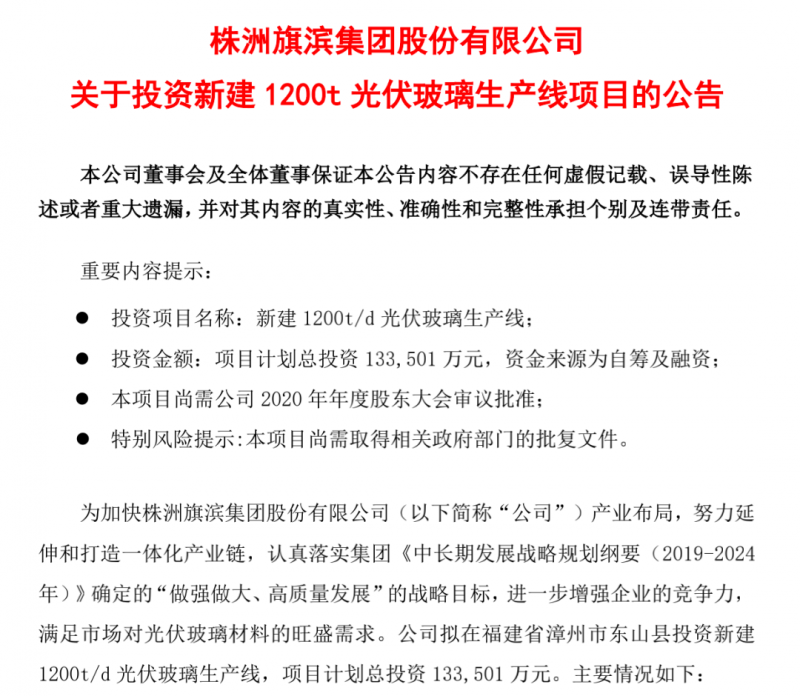 公告顯示,旗濱集團(tuán)擬在福建省漳州市東山縣投資新建1200t/d 光伏玻璃生產(chǎn)線,項(xiàng)目計(jì)劃總投資133,501萬元。