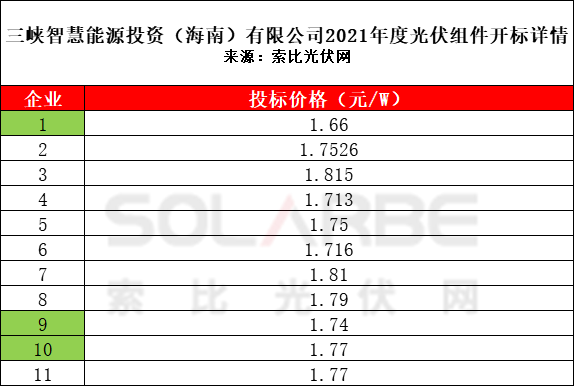 根據(jù)開標情況,本次招標共有11家企業(yè)參與投標,投標價格在1.66元/W~1.815元/W,最低價格由一線企業(yè)(下表標綠企業(yè))投出。