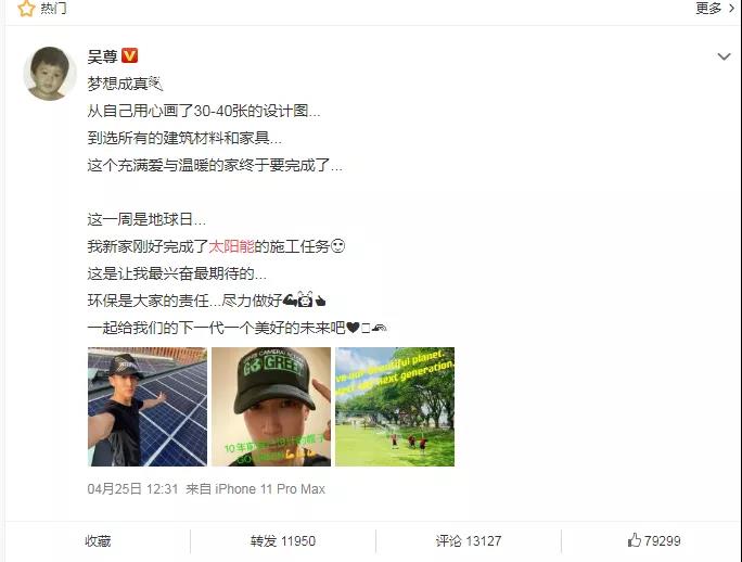 前幾天,明星吳尊發(fā)微博稱在自家屋頂安裝了太陽能光伏電站,在世界地球日為保護(hù)地球獻(xiàn)一分力: