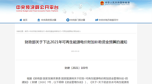 5月10日,財(cái)政部官網(wǎng)發(fā)布關(guān)于下達(dá)2021年可再生能源電價(jià)附加補(bǔ)助資金預(yù)算的通知。