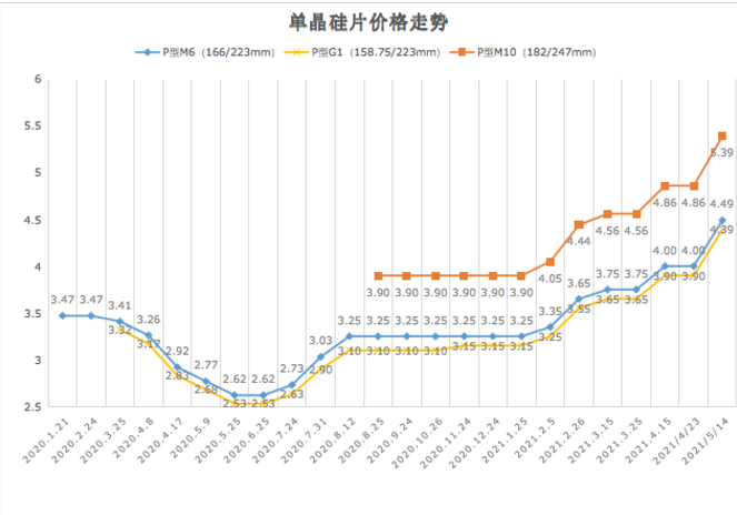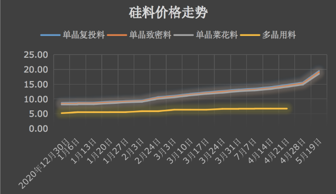今年以來,多晶硅價格漲幅遠超出行業(yè)預期,從年初的85元/kg左右的市場均價一路飆漲至當前的190元/kg,漲幅高達123.5%。多晶硅料價格暴漲之下,硅片、組件價格也漲勢迅猛,M6硅片從年初3.25元/片漲至最新的4.49元/片,漲幅達38.2%,組件則普遍上漲0.2~0.3元/瓦,最高價已經(jīng)突破1.9元/瓦。