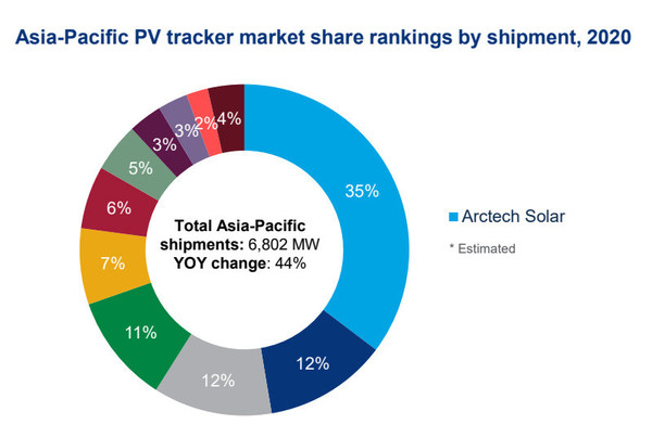 亞太市場光伏跟蹤系統(tǒng)出貨量排名;數(shù)據(jù)來源:Wood Mackenzie Power& Renewables