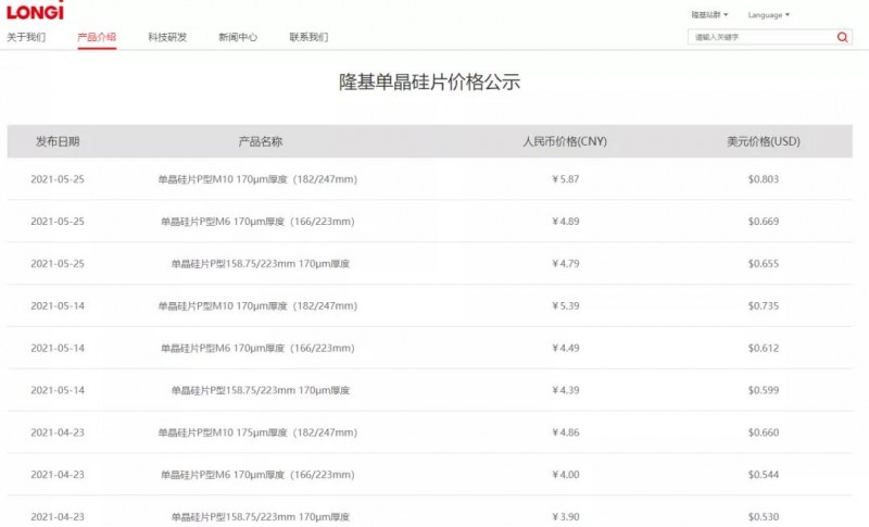 5月14日,隆基股份更新硅片價格。其中,G1報價4.39元/片,較4月23日公示價格提高0.49元,漲幅為12.56%;M6報價4.49元/片,上漲0.49元,漲幅為12.25%;M10報價5.39元/片,上漲0.53元,漲幅為10.9。今年以來,隆基股份已5次上調(diào)硅片價格。