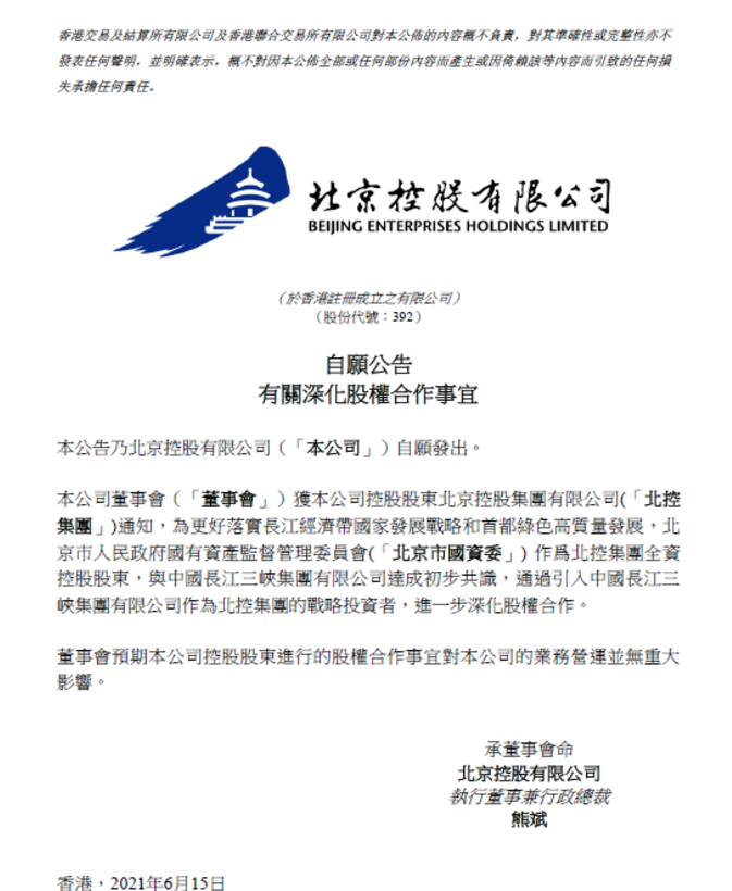 6月15日消息,北京控股(00392.HK)發(fā)布公告,董事會獲公司控股股東北京控股集團有限公司通知,為更好落實長江經(jīng)濟帶國家發(fā)展戰(zhàn)略和首都綠色高質(zhì)量發(fā)展,北京市國資委作為北控集團全資控股股東,與中國長江三峽集團有限公司達成初步共識,通過引入中國長江三峽集團有限公司作為北控集團的戰(zhàn)略投資者,進一步深化股權(quán)合作。