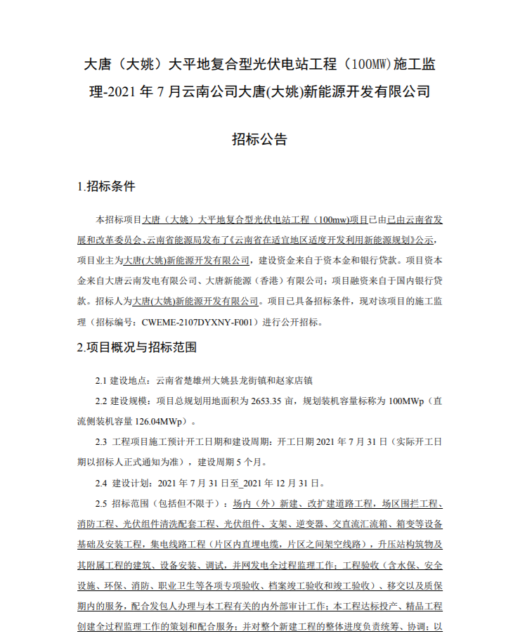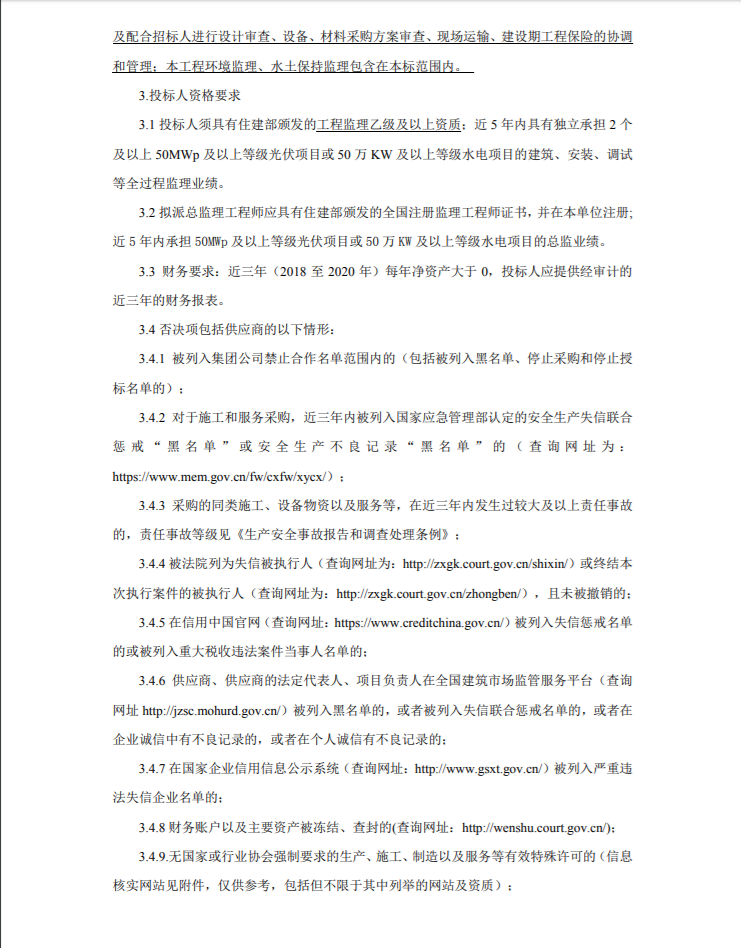 概況:場內(nèi)(外)新建、改擴(kuò)建道路工程,場區(qū)圍攔工程、消防工程、光伏組件清洗配套工程、光伏組件、支架、逆變器、交直流匯流箱、箱變等設(shè)備基礎(chǔ)及安裝工程,集電線路工程(片區(qū)內(nèi)直埋電纜,片區(qū)之間架空線路),升壓站構(gòu)筑物及其附屬工程的建筑、設(shè)備安裝、調(diào)試,并網(wǎng)發(fā)電全過程監(jiān)理工作;工程驗(yàn)收(含水保、安全設(shè)施、環(huán)保、消防、職業(yè)衛(wèi)生等各項(xiàng)專項(xiàng)驗(yàn)收、檔案竣工驗(yàn)收和竣工驗(yàn)收)、移交以及質(zhì)保期內(nèi)的服務(wù),配合發(fā)包人辦理與本工程有關(guān)的內(nèi)外部審計(jì)工作;本工程達(dá)標(biāo)投產(chǎn)、精品工程創(chuàng)建全過程監(jiān)理工作的策劃和配合服務(wù);并對整個(gè)新建工程的整體進(jìn)度負(fù)責(zé)統(tǒng)籌、協(xié)調(diào);以及配合招標(biāo)人進(jìn)行設(shè)計(jì)審查、設(shè)備、材料采購方案審查、現(xiàn)場運(yùn)輸、建設(shè)期工程保險(xiǎn)的協(xié)調(diào)和管理;本工程環(huán)境監(jiān)理、水土保持監(jiān)理包含在本標(biāo)范圍內(nèi)。