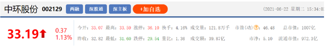 截至6月22日收盤,中環(huán)股份(002129.SZ)股價為33.19元/股,總市值達到1007億元。