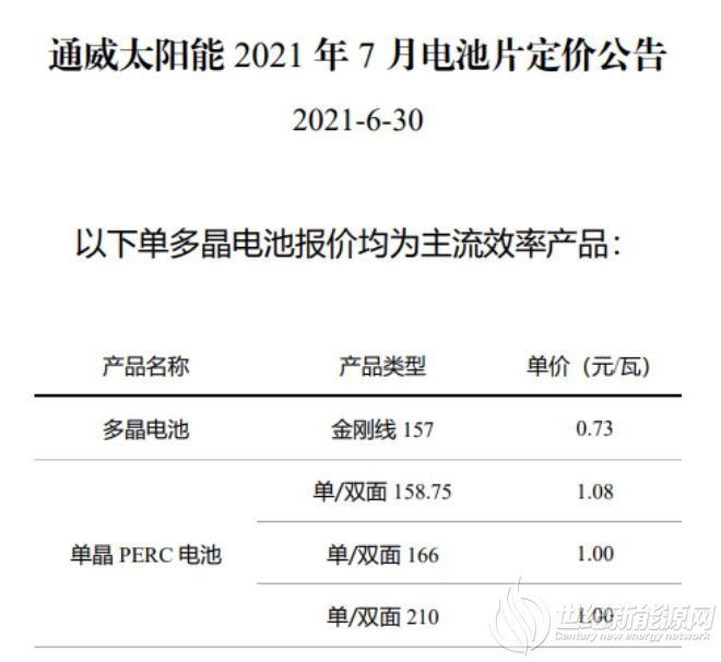 6月30日,在經(jīng)歷七連漲后,通威電池片價(jià)格終于迎來拐點(diǎn)。根據(jù)通威7月電池片電價(jià)公告,多晶157電池報(bào)價(jià)為0.73元/W,下調(diào)0.13元;單晶PERC 158.75電池價(jià)格1.08元/W,下調(diào)0.02元;單晶PERC 166電池報(bào)1.00元/W,下調(diào)0.08元;單晶PERC 210電池定價(jià)為1.00元/W,下調(diào)0.08元。