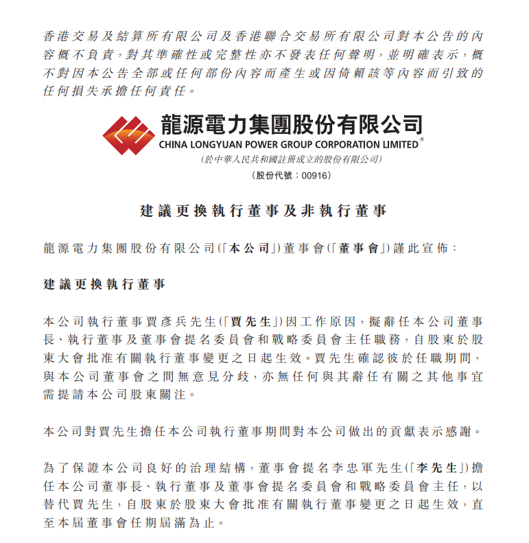 6月8日,龍源電力發(fā)布建議更換執(zhí)行董事及非執(zhí)行董事公告。