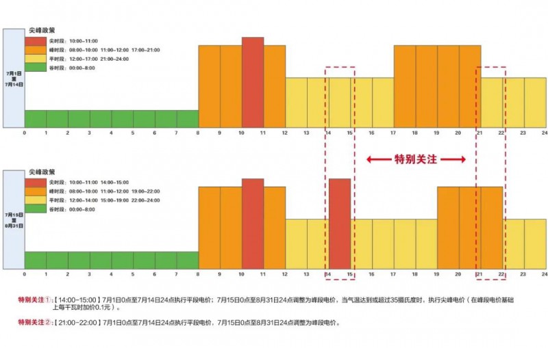 日最高氣溫達到或超過35℃時,上午10:00-11:00,在現行峰段電價基礎上,每千瓦時加價0.1元。下午14:00-15:00,在峰段電價基礎上每千瓦時加價0.1元。具體時段調整為: