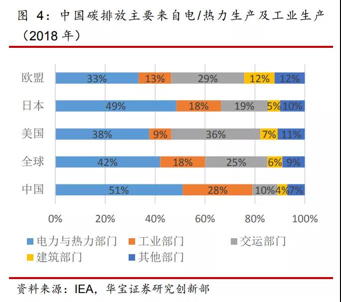 電熱力生產(chǎn)及工業(yè)集中用煤、交通領(lǐng)域大量耗油是導(dǎo)致中國碳排放量較大的主因。根據(jù)英國BP的2019年數(shù)據(jù),中國93%的碳排放來自于化石燃料的使用,其中68% 來自于固體燃料如煤炭,23%來自于液體燃料如石油等,9%來自于氣體燃料如天然氣等。