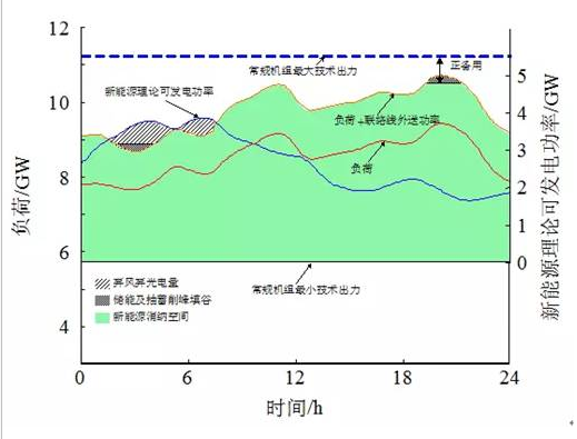 對(duì)于內(nèi)部無(wú)網(wǎng)絡(luò)約束的系統(tǒng),新能源消納只需滿足發(fā)、用電動(dòng)態(tài)平衡和系統(tǒng)調(diào)節(jié)能力下限約束,“負(fù)荷+聯(lián)絡(luò)線外送功率”曲線與系統(tǒng)調(diào)節(jié)能力下限之間的系統(tǒng)調(diào)節(jié)空間,即理論上的新能源最大消納空間。
