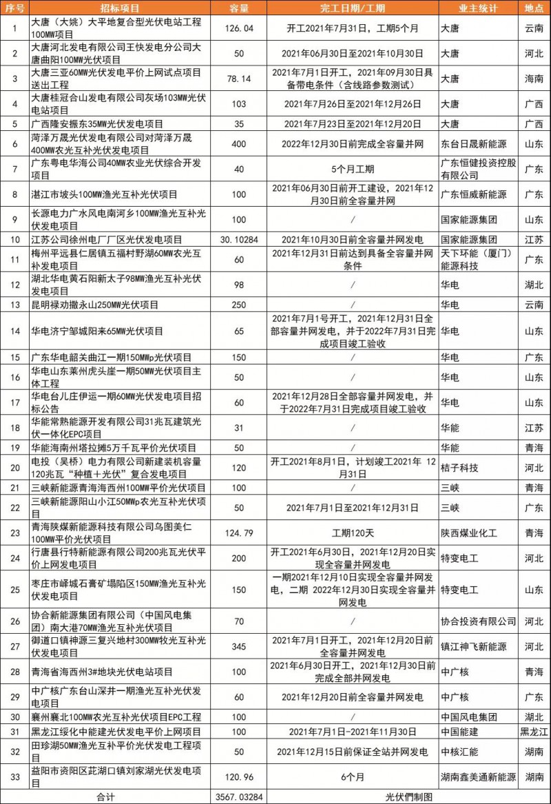 從統(tǒng)計(jì)項(xiàng)目的并網(wǎng)時(shí)間來看,大部分依然集中于2021年底前并網(wǎng),其中約1.5GW為2019年和2020年的存量項(xiàng)目;從統(tǒng)計(jì)的招標(biāo)容量來看,TOP 5分別是華電(673MW)、東臺(tái)日晟新能源(400MW)、大唐(392.18MW)、特變電工(350MW)、鎮(zhèn)江神飛新能源(345MW)。其中東臺(tái)日晟新能源400MW容量為菏澤萬晟400MW農(nóng)光互補(bǔ)光伏發(fā)電項(xiàng)目,該項(xiàng)目要求2022年12月30日前完成全容量并網(wǎng)。