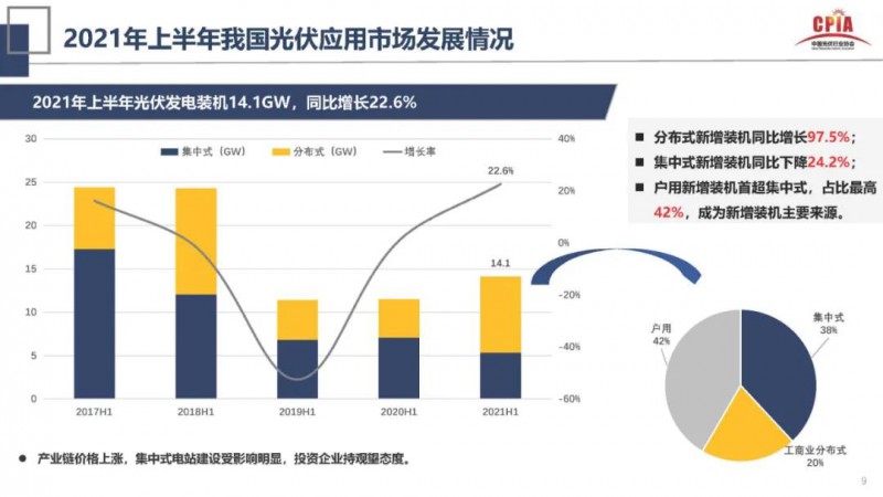 不過,相比于地面電站,今年分布式光伏市場(chǎng)有望迎來新突破。根據(jù)中國(guó)光伏行業(yè)協(xié)會(huì)數(shù)據(jù),上半年光伏新增裝機(jī)14.1GW,其中分布式占比達(dá)到62%,戶用新增裝機(jī)占比42%,超過集中式電站,成為上半年新增裝機(jī)主要來源。