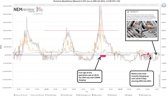 這張來(lái)自Watt Clarity的圖表顯示維多利亞大電池項(xiàng)目在周四做了一些測(cè)試,然后在周五早上又做了一次,就在火災(zāi)發(fā)生之前。