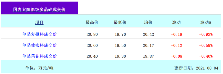 單晶復(fù)投料均價(jià)20.42萬元/噸,環(huán)比下降0.92%;