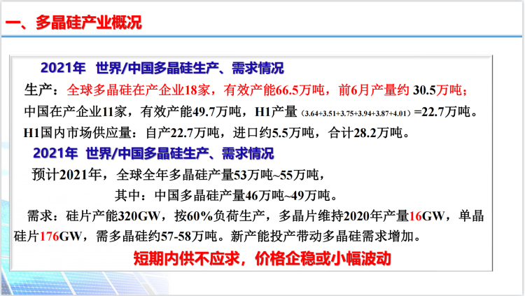 據(jù)介紹,預(yù)計(jì)2021年,全球多晶硅年產(chǎn)量53-55萬噸,其中中國多晶硅產(chǎn)量46-49萬噸。另一方面,按照硅片平均產(chǎn)能利用率60%計(jì)算,對(duì)多晶硅的需求約57-58萬噸,短期內(nèi)會(huì)呈現(xiàn)供不應(yīng)求的趨勢,價(jià)格可能會(huì)出現(xiàn)小幅波動(dòng)。