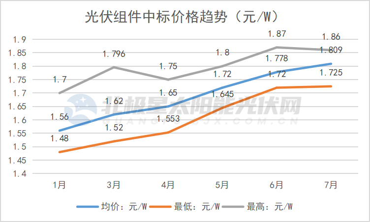 在硅料供需不平衡、價格波動的影響下,光伏組件價格隨之水漲船高。據(jù)北極星太陽能光伏網(wǎng)梳理,1-7月,光伏組件價格一路走高,1月份最低價格在1.48元/W,7月份已漲至1.725元/W,而最高價格也由1.7元沖上1.86元/W。