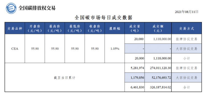 截至今日,全國(guó)碳市場(chǎng)碳排放配額(CEA)累計(jì)成交量6,461,830噸,累計(jì)成交額326,187,814.02元。
