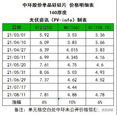 同日,中環(huán)股份公布了170μm、165μm、160μm三種厚度的硅片價格。以170厚度為例,與上次公開數(shù)據(jù)相比,166硅片上漲0.44元,漲幅達10%;210硅片上漲0.44元,漲幅為6%,158.75硅片上漲0.26元,漲幅為6%。本次價格自今日開始施行。